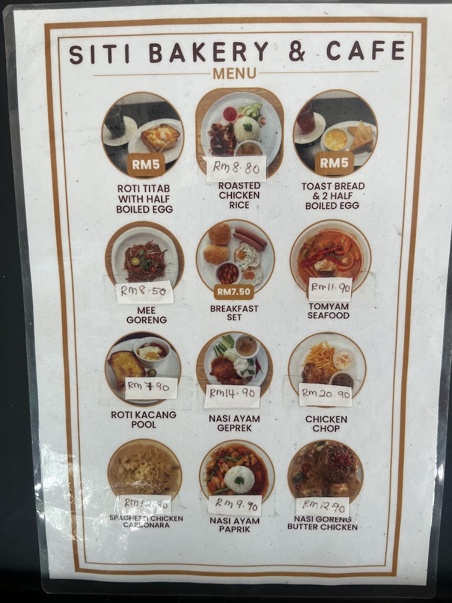 The menu offers a variety of food and drink options suitable for different times of the day, including breakfast, light meals, and casual dining. Visitors can expect to find a selection of local Malaysian dishes alongside lighter fare typical of cafe settings.